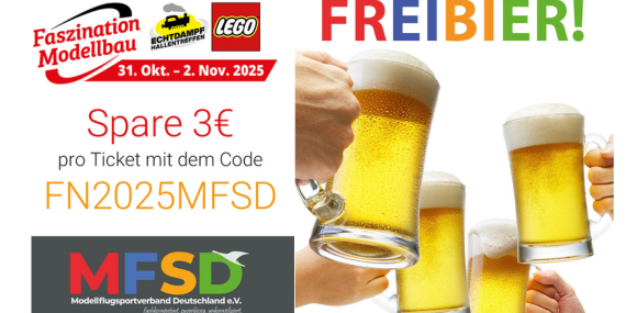 Übermorgen öffnet die Faszination Modellbau in Friedrichshafen ihre Pforten und wir sind natürlich wieder mit dabei. Um die Vorfreude noch zu steigern, bieten wir dir mit dem Gutscheincode FN2025MFSD einen Rabatt von 3,- € auf die reguläre Tageskarte im Ticketshop der Faszination Modellbau an.