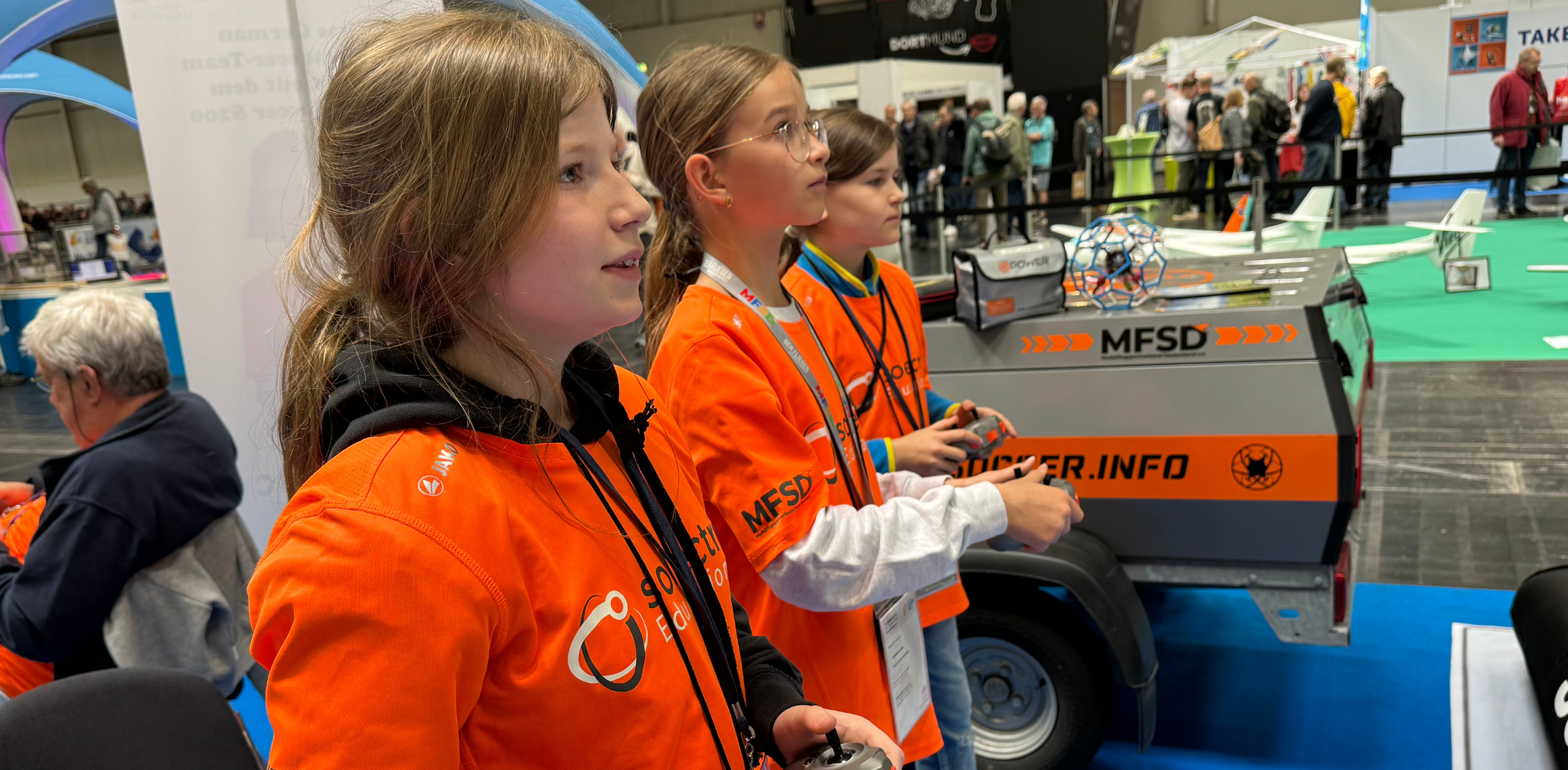 Unser Drone-Soccer-Team lud alle Gäste der Messe zum Fliegen ein. Die Piloten hatten alle Mühe, den großen Ansturm zu bewältigen, und die Ladegeräte mussten Schwerstarbeit leisten.