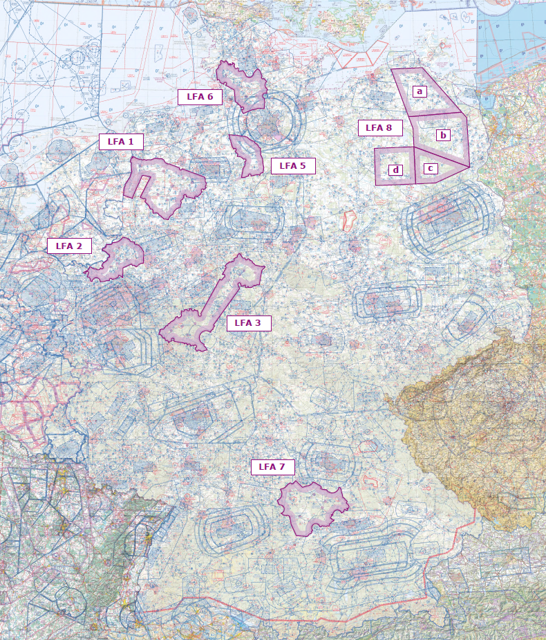 - fest definierte Tieffluggebiete „LFA250“ (LFA = Low Flying Areas),